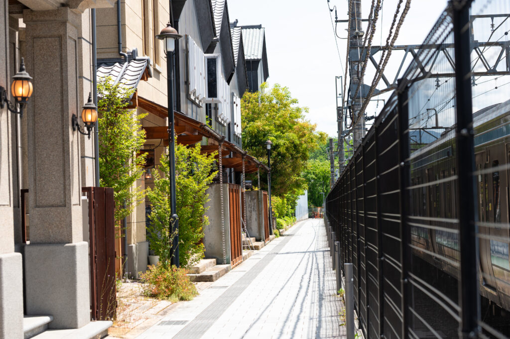 踏切の近くには焼き鳥店や和菓子店が立ち並び、踏切を渡って南へ進むと、舞鶴城公園の東側に迫力ある高石垣がそびえます。その通り沿いには、カフェや飲食店も点在し、散策がさらに楽しくなります。