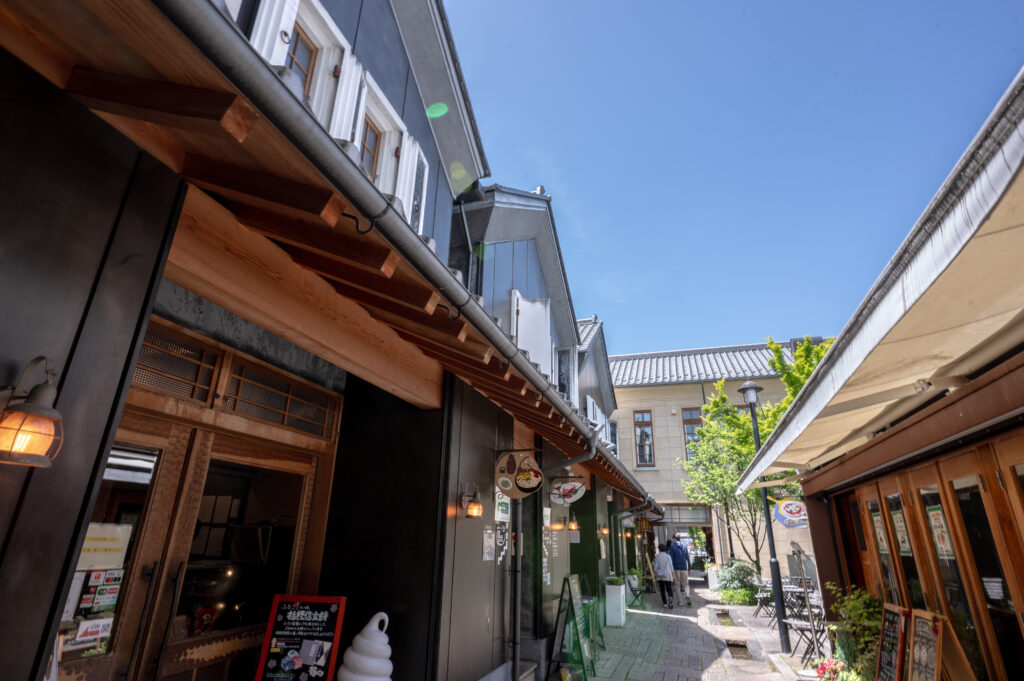 甲府駅北口すぐの「甲州夢小路」は、甲府城跡「甲府市歴史公園」に隣接する、レトロな雰囲気が魅力のスポットです。石畳の通り沿いには、蔵造りの建物が並び、カフェやグルメ、山梨の特産品を扱うショップが点在。歴史情緒あふれる街並みを散策しながら、ティータイムやお買い物をゆっくり楽しめます。
