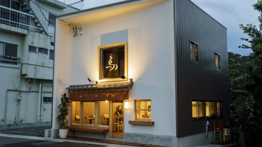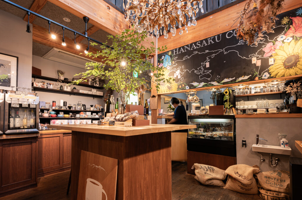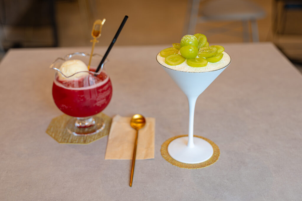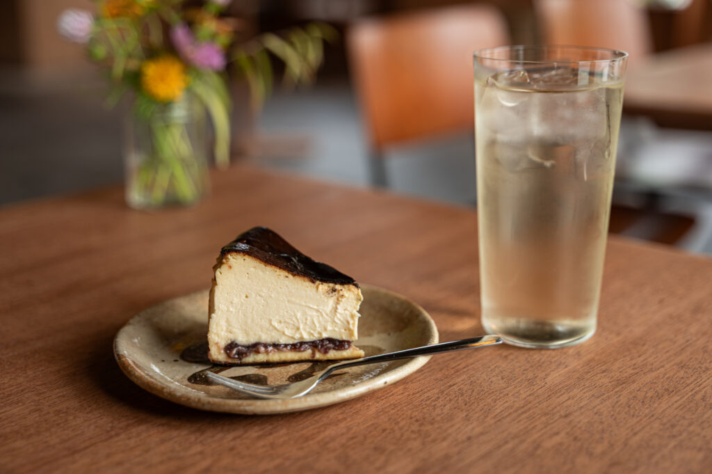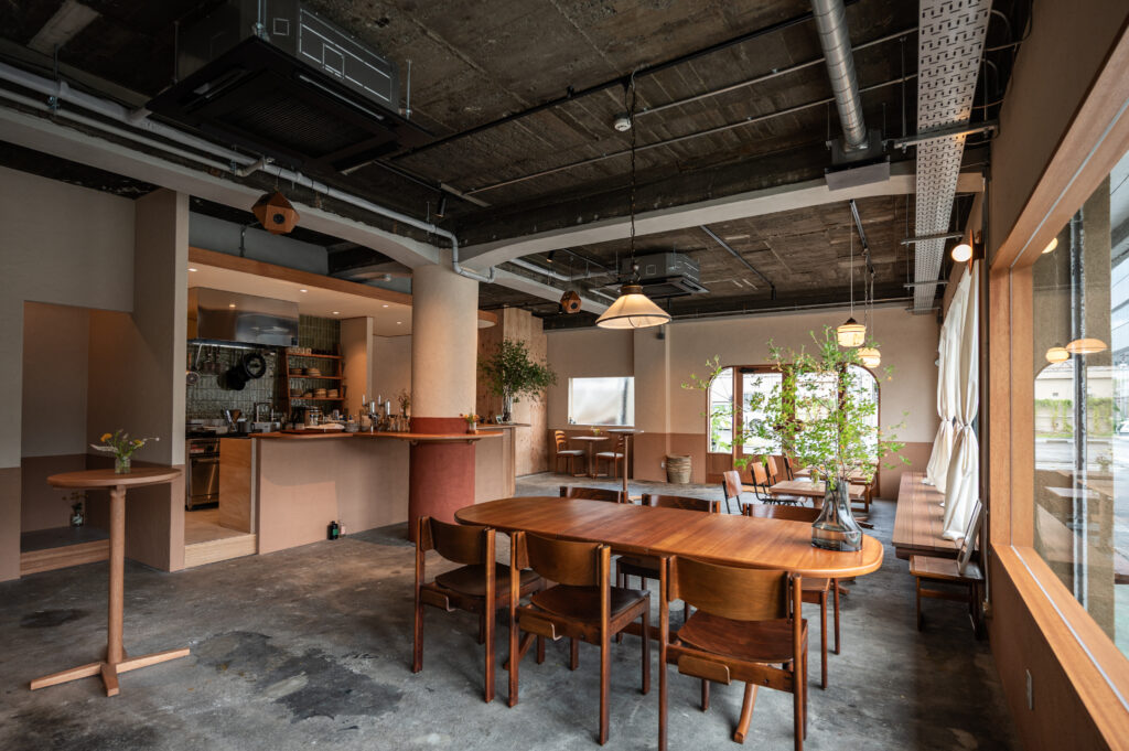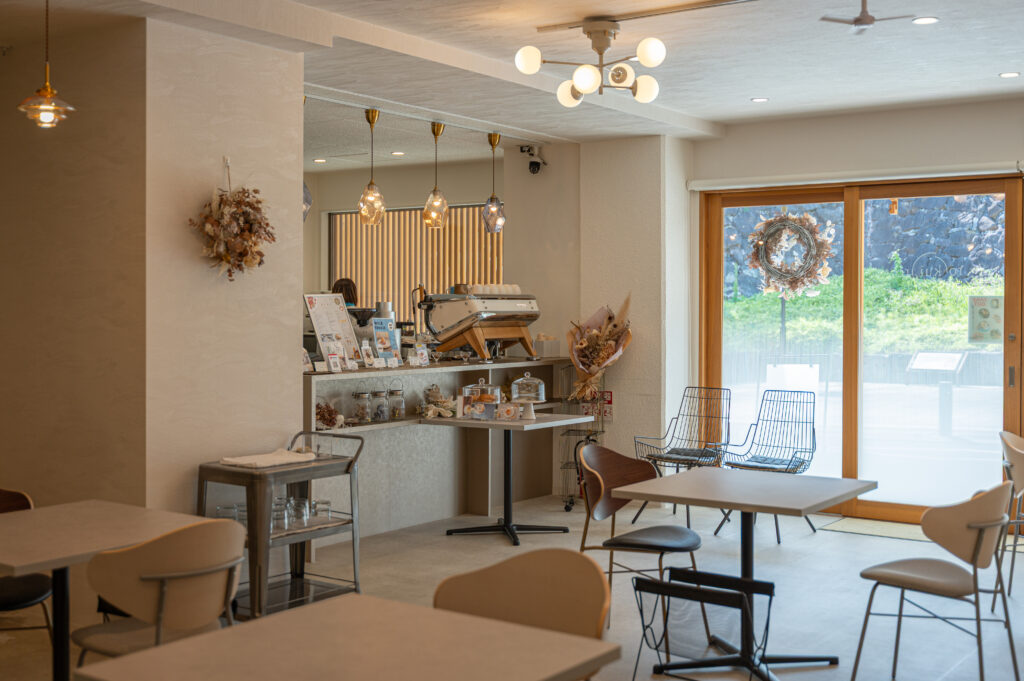建物は3階建てで、3階には2025年11月に個室3部屋の宿泊施設がオープン予定。2階はギャラリー(現在準備中)、1階にはカフェ&バーとグローサリーショップが併設されています。1階のカフェは、静かで洗練された大人の隠れ家のような空間。無機質なコンクリートと温もりある木製家具が調和し、柔らかな自然光が差し込みます。窓の外に広がる緑や石垣を眺めながら、淹れたてのハーブティーとともに穏やかな時間を過ごせます。