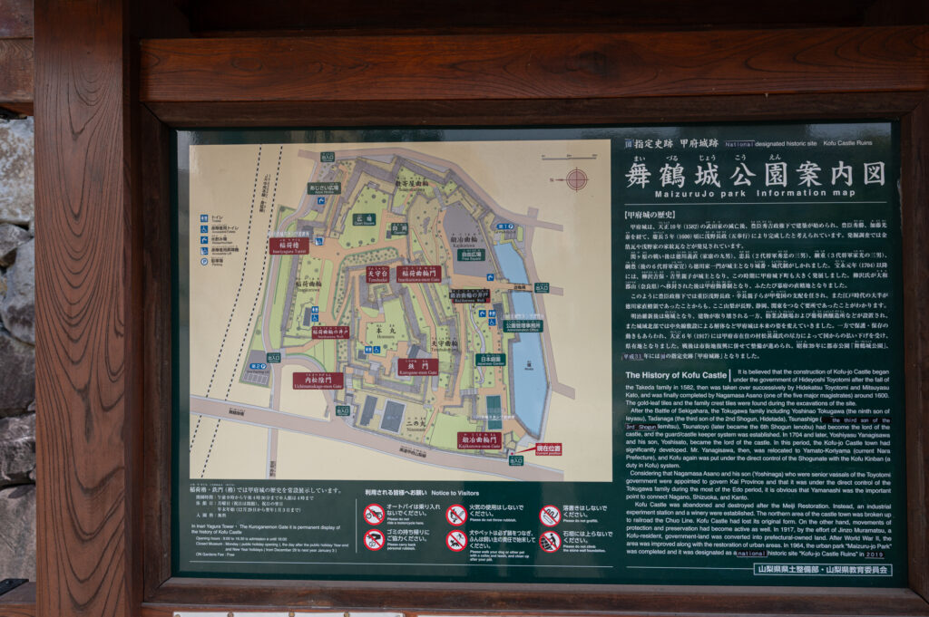 甲府駅からすぐというアクセスしやすい立地も魅力の一つ。散策路が整備され、訪れる人々が心地よく過ごせるよう工夫されています。お城の歴史に触れながら、のんびりと過ごす時間もまた、舞鶴城公園の大きな魅力です。
