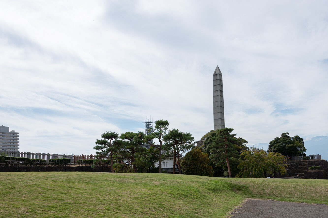 舞鶴城公園の園内に建つ、高さ約30.3mの、ひときわ目を引く石造りの記念碑。構造は「碑台」「碑身」「方維体(ピラミッド型)」から成り、碑身は十個の花崗岩を積み上げたオベリスク形。碑台は古代エジプトの神殿門「パイロン」を模した独特の意匠です。使用された花崗岩は、旧皇室山林(現在の甲州市神金地区)から切り出されたもの。明治末期に度重なった水害をきっかけに、明治天皇から御料地が下賜され、森林保全を進める契機となりました。謝恩碑はその「恩賜林」を記念して建立されたものです。