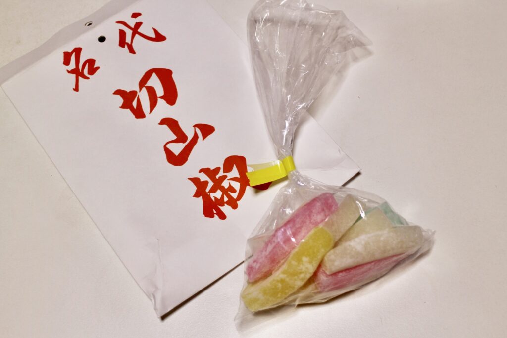 また、この地域ならではの縁起物もたくさん見つかります。特に、甲州だるまや熊手を商う店のほか、山梨の節分菓子として知られる「切山椒(きりざんしょう)」を売る露店は、この祭りならではの光景です。 切山椒は、上新粉に山椒と砂糖を加えて作る素朴な味わいのお菓子で、春を告げる味として親しまれています。
