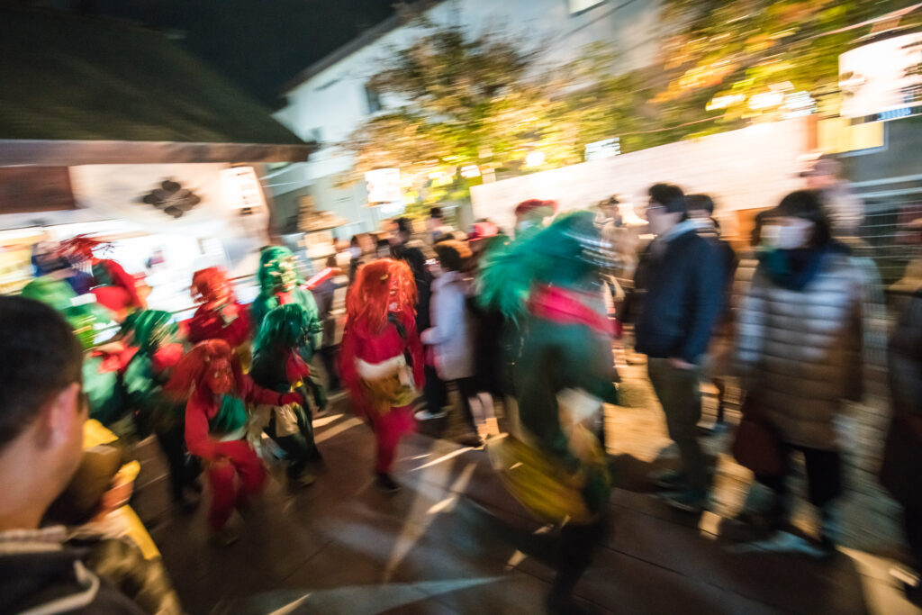 神社周辺には赤鬼や青鬼が登場し、写真撮影などを通して会場を盛り上げます。さらに、神輿渡御などの伝統的な神事も行われ、迫力ある光景が広がります。