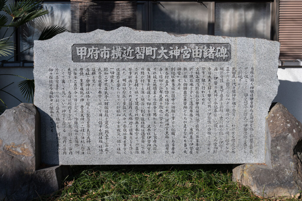 横近習大神宮(よこきんじゅだいじんぐう)天照皇大神、豊受大神平安時代の寛治年間に創建され、甲府城が築かれる際に現在の場所へ移されたと伝えられています。かつては伊勢神宮のお札などを甲斐国一帯に配る役目も担っていました。
