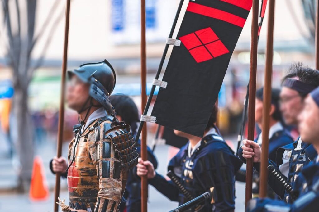 信玄公祭りのハイライトは、何と言っても「甲州軍団出陣」です。 これは、武田信玄が川中島の合戦へ向かう様子を再現したもので、1,000人を超える人々が武者姿で甲府市中心部を練り歩きます。 その規模は「世界最大の侍パレード」とも言われ、見る人を戦国時代へと誘います。